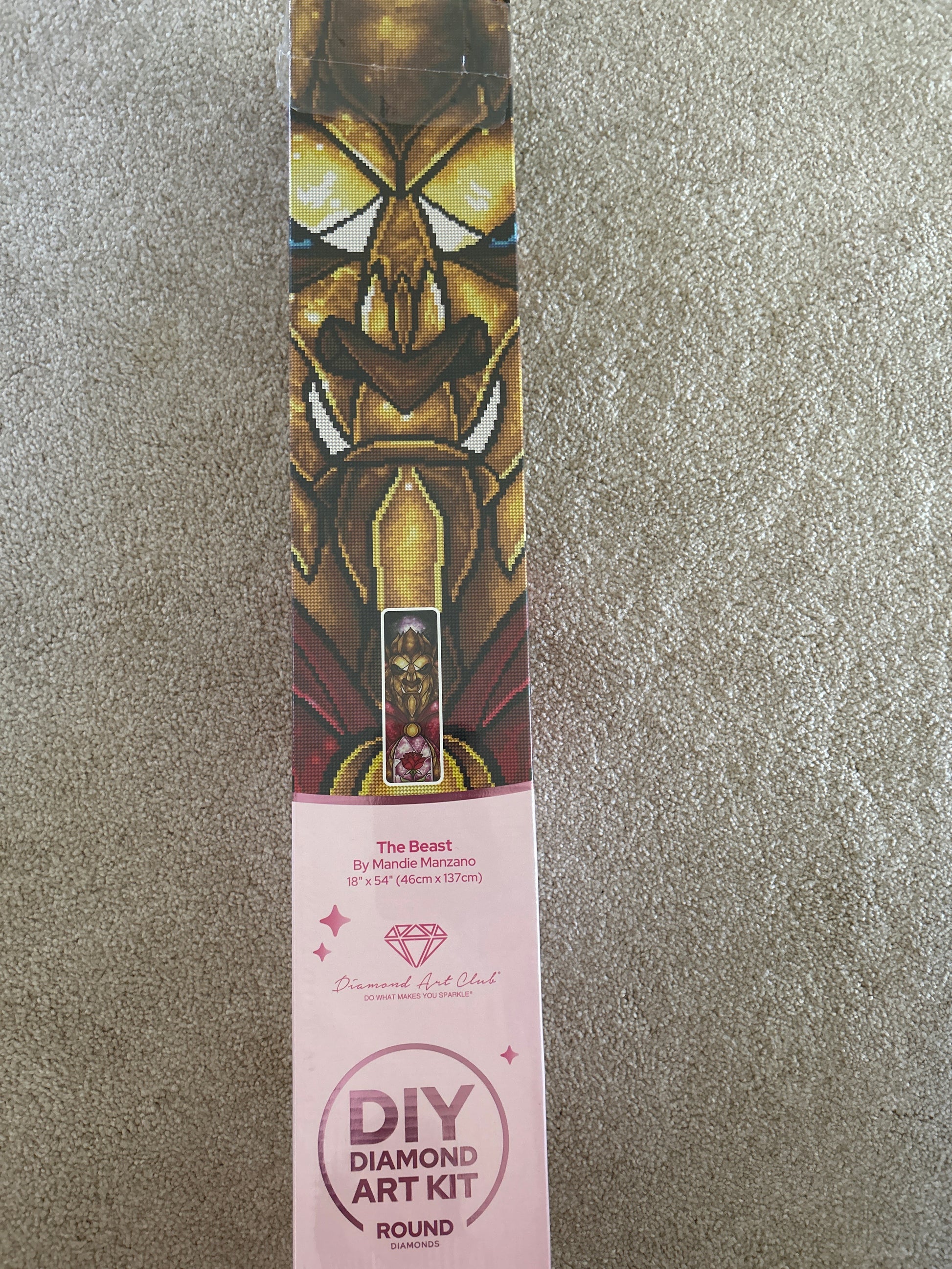 Destashing this kit. It is a round kit. Box has been opened to check contents. Trading card is not included. This kit is no longer in production. New box so picture of canvas is on the bottom already.